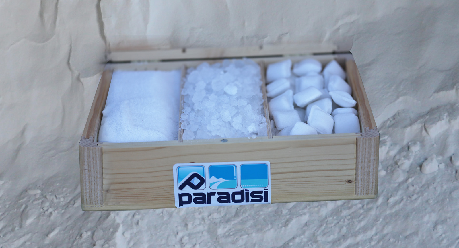 – Salgemma in cristalli purissimi, selezionati per la rigenerazione delle resine degli addolcitori. Le varie dimensioni dei cristalli sono appositamente studiate per una dissoluzione lenta e costante.